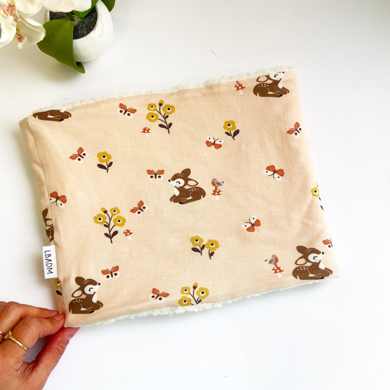 Cuello o Buff de punto jersey de algodón orgánico, su interior es de borreguito muy calentito, ideal para los días de frio.