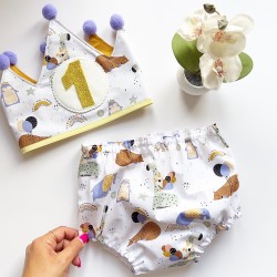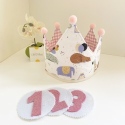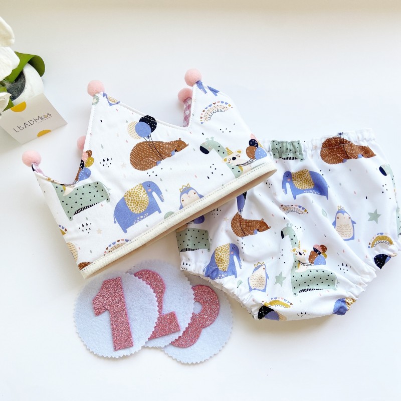 Conjunto con corona reversible: diseñada para usarse por ambos lados, incluye 3 números intercambiables. Combinamos telas infantiles con estampado vichy en el interior, teniendo siempre en cuenta la gama de colores.