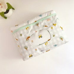 Se cierra con cremallera y el bolsillo exterior para las toallitas cierra con un broche a presión.