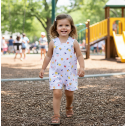 Peto de bebé con estampado de FRUTAS en tonos claros, un diseño delicado, atemporal y lleno de encanto para el verano, Su estampado aporta un aire dulce y original, ideal para quienes buscan una prenda especial, diferente y cómoda.