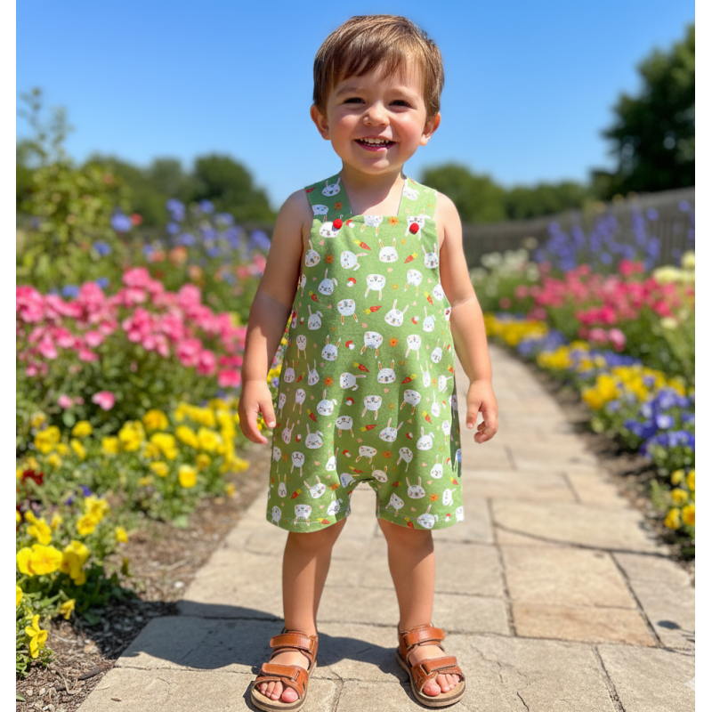 Peto de bebé con estampado de CONEJOS en tonos verdes, un diseño delicado, atemporal y lleno de encanto para el verano, Su estampado aporta un aire dulce y original, ideal para quienes buscan una prenda especial, diferente y cómoda.